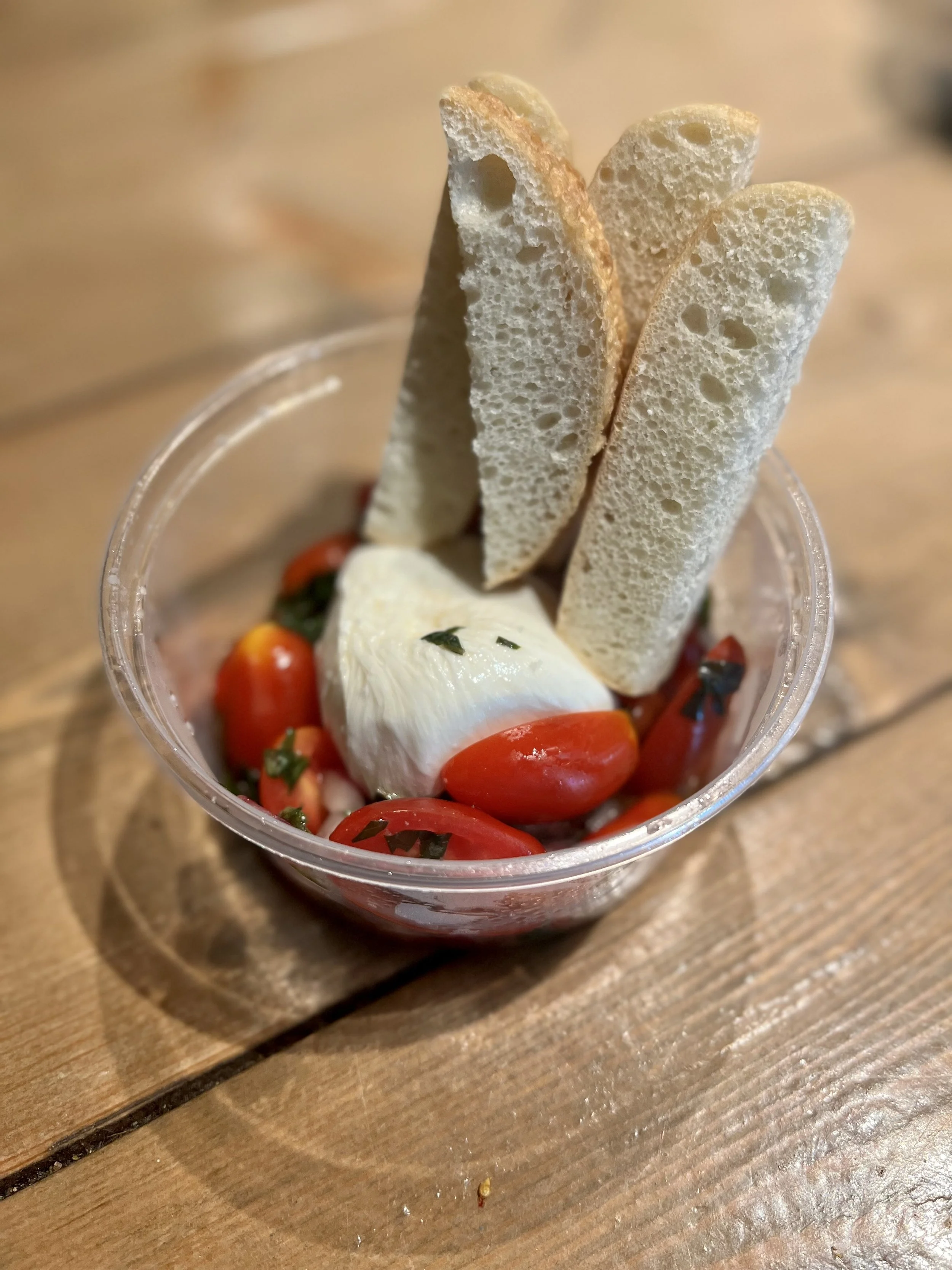 Fresh mozzarella, basil pesto, roasted tomatoes, fresh basil